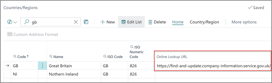 Once Clever Credit is installed, the Countries/Regions list will feature a new Online Lookup URL column that is automatically populated for the Great Britain Country Code. The system works as intended without requiring any additional adjustments.